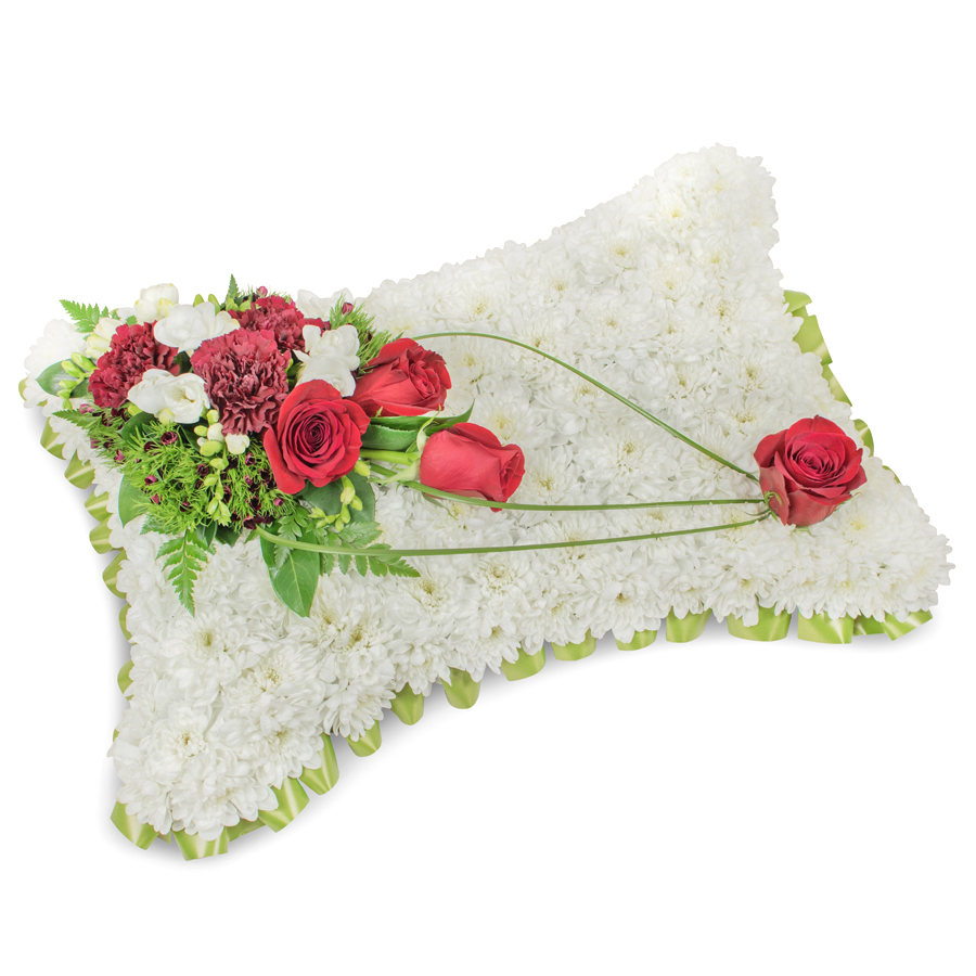 Present a graceful expression of sympathy with our meticulously designed floral arrangement. This stunning bouquet features a curated selection of white chrysanthemums, red roses, white freesias, dark red carnations, dianthus, and bear grass. Each flower is carefully hand-selected for its unparalleled freshness and lasting beauty.